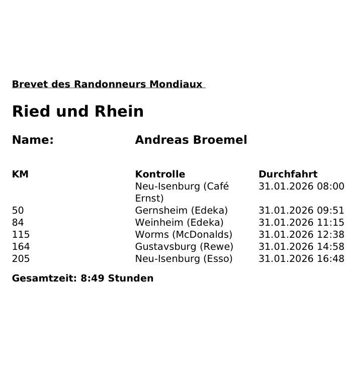Zurück führte die Route rheinaufwärts auf rheinland-pfälzischer Seite bis Laubenheim, dann hinüber an den Main bei Rüsselsheim und über Kelsterbach zurück nach Neu-Isenburg. Bei 2 bis 5 Grad benötigte Andreas 7 Stunden und 36 Minuten Fahrzeit; inklusive Kontrollen und Halbzeitverpflegung standen am Ende 8 Stunden und 49 Minuten auf der Uhr.