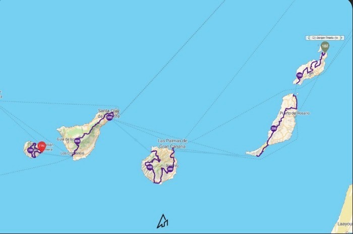 Anmerkung: Den ersten Tag hat Thorge nach 11h05m und 255 km / 4000 hm im Sattel die Fähre nach Gran Canaria erreicht. Morgen erwartet ihn die Königsetappe auf Gran Canaria mit 250 km und 5.850 hm.